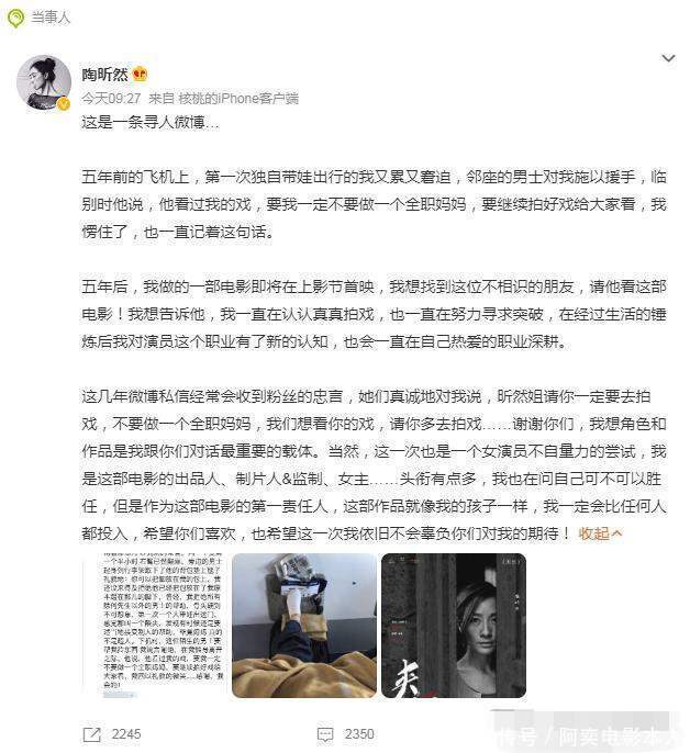 2023年陶昕然自导自演的电影《夹缝之间》上映时,她曾发布一条微博“寻人启事”,寻找一位五年前在飞机上对独自带娃出行的她施以援手的男士,当时那位好心的男士鼓励她: